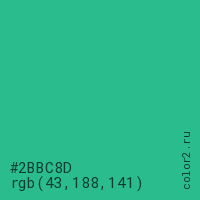 Цвет #2BBC8D в цветовой модели RGB обозначается тремя октетами (43, 188, 141) в десятичном формате и #2BBC8D в шестнадцатиричном (hex) формате, которые являются интенсивностью красного 43 (hex 2B), интенсивность зелёного 188 (hex BC) и интенсивность синего 141 (hex 8D).