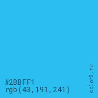 Цвет #2BBFF1 в цветовой модели RGB обозначается тремя октетами (43, 191, 241) в десятичном формате и #2BBFF1 в шестнадцатиричном (hex) формате, которые являются интенсивностью красного 43 (hex 2B), интенсивность зелёного 191 (hex BF) и интенсивность синего 241 (hex F1).