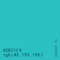 Цвет #2BC1C4 в цветовой модели RGB обозначается тремя октетами (43, 193, 196) в десятичном формате и #2BC1C4 в шестнадцатиричном (hex) формате, которые являются интенсивностью красного 43 (hex 2B), интенсивность зелёного 193 (hex C1) и интенсивность синего 196 (hex C4).