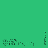 Цвет #2BC276 в цветовой модели RGB обозначается тремя октетами (43, 194, 118) в десятичном формате и #2BC276 в шестнадцатиричном (hex) формате, которые являются интенсивностью красного 43 (hex 2B), интенсивность зелёного 194 (hex C2) и интенсивность синего 118 (hex 76).