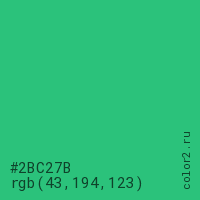 Цвет #2BC27B в цветовой модели RGB обозначается тремя октетами (43, 194, 123) в десятичном формате и #2BC27B в шестнадцатиричном (hex) формате, которые являются интенсивностью красного 43 (hex 2B), интенсивность зелёного 194 (hex C2) и интенсивность синего 123 (hex 7B).
