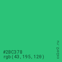 Цвет #2BC378 в цветовой модели RGB обозначается тремя октетами (43, 195, 120) в десятичном формате и #2BC378 в шестнадцатиричном (hex) формате, которые являются интенсивностью красного 43 (hex 2B), интенсивность зелёного 195 (hex C3) и интенсивность синего 120 (hex 78).