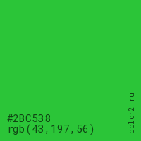 Цвет #2BC538 в цветовой модели RGB обозначается тремя октетами (43, 197, 56) в десятичном формате и #2BC538 в шестнадцатиричном (hex) формате, которые являются интенсивностью красного 43 (hex 2B), интенсивность зелёного 197 (hex C5) и интенсивность синего 56 (hex 38).