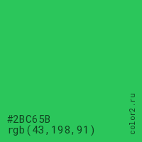 Цвет #2BC65B в цветовой модели RGB обозначается тремя октетами (43, 198, 91) в десятичном формате и #2BC65B в шестнадцатиричном (hex) формате, которые являются интенсивностью красного 43 (hex 2B), интенсивность зелёного 198 (hex C6) и интенсивность синего 91 (hex 5B).