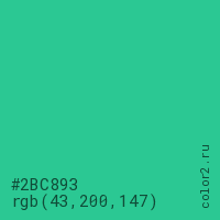 Цвет #2BC893 в цветовой модели RGB обозначается тремя октетами (43, 200, 147) в десятичном формате и #2BC893 в шестнадцатиричном (hex) формате, которые являются интенсивностью красного 43 (hex 2B), интенсивность зелёного 200 (hex C8) и интенсивность синего 147 (hex 93).