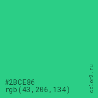Цвет #2BCE86 в цветовой модели RGB обозначается тремя октетами (43, 206, 134) в десятичном формате и #2BCE86 в шестнадцатиричном (hex) формате, которые являются интенсивностью красного 43 (hex 2B), интенсивность зелёного 206 (hex CE) и интенсивность синего 134 (hex 86).