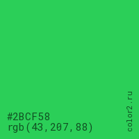 Цвет #2BCF58 в цветовой модели RGB обозначается тремя октетами (43, 207, 88) в десятичном формате и #2BCF58 в шестнадцатиричном (hex) формате, которые являются интенсивностью красного 43 (hex 2B), интенсивность зелёного 207 (hex CF) и интенсивность синего 88 (hex 58).