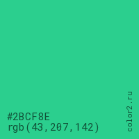 Цвет #2BCF8E в цветовой модели RGB обозначается тремя октетами (43, 207, 142) в десятичном формате и #2BCF8E в шестнадцатиричном (hex) формате, которые являются интенсивностью красного 43 (hex 2B), интенсивность зелёного 207 (hex CF) и интенсивность синего 142 (hex 8E).