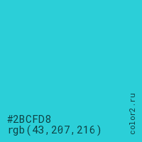Цвет #2BCFD8 в цветовой модели RGB обозначается тремя октетами (43, 207, 216) в десятичном формате и #2BCFD8 в шестнадцатиричном (hex) формате, которые являются интенсивностью красного 43 (hex 2B), интенсивность зелёного 207 (hex CF) и интенсивность синего 216 (hex D8).
