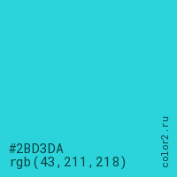 Цвет #2BD3DA в цветовой модели RGB обозначается тремя октетами (43, 211, 218) в десятичном формате и #2BD3DA в шестнадцатиричном (hex) формате, которые являются интенсивностью красного 43 (hex 2B), интенсивность зелёного 211 (hex D3) и интенсивность синего 218 (hex DA).