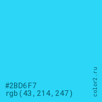 Цвет #2BD6F7 в цветовой модели RGB обозначается тремя октетами (43, 214, 247) в десятичном формате и #2BD6F7 в шестнадцатиричном (hex) формате, которые являются интенсивностью красного 43 (hex 2B), интенсивность зелёного 214 (hex D6) и интенсивность синего 247 (hex F7).