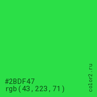 Цвет #2BDF47 в цветовой модели RGB обозначается тремя октетами (43, 223, 71) в десятичном формате и #2BDF47 в шестнадцатиричном (hex) формате, которые являются интенсивностью красного 43 (hex 2B), интенсивность зелёного 223 (hex DF) и интенсивность синего 71 (hex 47).