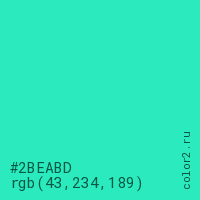 Цвет #2BEABD в цветовой модели RGB обозначается тремя октетами (43, 234, 189) в десятичном формате и #2BEABD в шестнадцатиричном (hex) формате, которые являются интенсивностью красного 43 (hex 2B), интенсивность зелёного 234 (hex EA) и интенсивность синего 189 (hex BD).