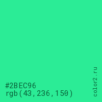 Цвет #2BEC96 в цветовой модели RGB обозначается тремя октетами (43, 236, 150) в десятичном формате и #2BEC96 в шестнадцатиричном (hex) формате, которые являются интенсивностью красного 43 (hex 2B), интенсивность зелёного 236 (hex EC) и интенсивность синего 150 (hex 96).