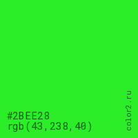 Цвет #2BEE28 в цветовой модели RGB обозначается тремя октетами (43, 238, 40) в десятичном формате и #2BEE28 в шестнадцатиричном (hex) формате, которые являются интенсивностью красного 43 (hex 2B), интенсивность зелёного 238 (hex EE) и интенсивность синего 40 (hex 28).