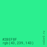 Цвет #2BEF8F в цветовой модели RGB обозначается тремя октетами (43, 239, 143) в десятичном формате и #2BEF8F в шестнадцатиричном (hex) формате, которые являются интенсивностью красного 43 (hex 2B), интенсивность зелёного 239 (hex EF) и интенсивность синего 143 (hex 8F).