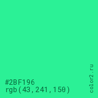 Цвет #2BF196 в цветовой модели RGB обозначается тремя октетами (43, 241, 150) в десятичном формате и #2BF196 в шестнадцатиричном (hex) формате, которые являются интенсивностью красного 43 (hex 2B), интенсивность зелёного 241 (hex F1) и интенсивность синего 150 (hex 96).