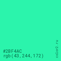 Цвет #2BF4AC в цветовой модели RGB обозначается тремя октетами (43, 244, 172) в десятичном формате и #2BF4AC в шестнадцатиричном (hex) формате, которые являются интенсивностью красного 43 (hex 2B), интенсивность зелёного 244 (hex F4) и интенсивность синего 172 (hex AC).