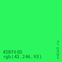 Цвет #2BF65D в цветовой модели RGB обозначается тремя октетами (43, 246, 93) в десятичном формате и #2BF65D в шестнадцатиричном (hex) формате, которые являются интенсивностью красного 43 (hex 2B), интенсивность зелёного 246 (hex F6) и интенсивность синего 93 (hex 5D).