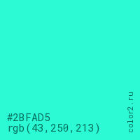 Цвет #2BFAD5 в цветовой модели RGB обозначается тремя октетами (43, 250, 213) в десятичном формате и #2BFAD5 в шестнадцатиричном (hex) формате, которые являются интенсивностью красного 43 (hex 2B), интенсивность зелёного 250 (hex FA) и интенсивность синего 213 (hex D5).