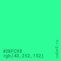 Цвет #2BFC98 в цветовой модели RGB обозначается тремя октетами (43, 252, 152) в десятичном формате и #2BFC98 в шестнадцатиричном (hex) формате, которые являются интенсивностью красного 43 (hex 2B), интенсивность зелёного 252 (hex FC) и интенсивность синего 152 (hex 98).