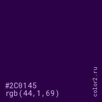 Цвет #2C0145 в цветовой модели RGB обозначается тремя октетами (44, 1, 69) в десятичном формате и #2C0145 в шестнадцатиричном (hex) формате, которые являются интенсивностью красного 44 (hex 2C), интенсивность зелёного 1 (hex 01) и интенсивность синего 69 (hex 45).