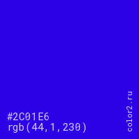 Цвет #2C01E6 в цветовой модели RGB обозначается тремя октетами (44, 1, 230) в десятичном формате и #2C01E6 в шестнадцатиричном (hex) формате, которые являются интенсивностью красного 44 (hex 2C), интенсивность зелёного 1 (hex 01) и интенсивность синего 230 (hex E6).