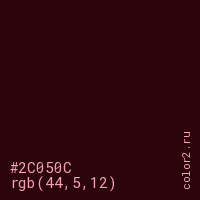 Цвет #2C050C в цветовой модели RGB обозначается тремя октетами (44, 5, 12) в десятичном формате и #2C050C в шестнадцатиричном (hex) формате, которые являются интенсивностью красного 44 (hex 2C), интенсивность зелёного 5 (hex 05) и интенсивность синего 12 (hex 0C).