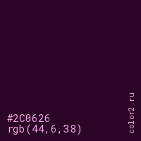 Цвет #2C0626 в цветовой модели RGB обозначается тремя октетами (44, 6, 38) в десятичном формате и #2C0626 в шестнадцатиричном (hex) формате, которые являются интенсивностью красного 44 (hex 2C), интенсивность зелёного 6 (hex 06) и интенсивность синего 38 (hex 26).
