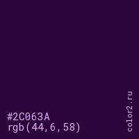 Цвет #2C063A в цветовой модели RGB обозначается тремя октетами (44, 6, 58) в десятичном формате и #2C063A в шестнадцатиричном (hex) формате, которые являются интенсивностью красного 44 (hex 2C), интенсивность зелёного 6 (hex 06) и интенсивность синего 58 (hex 3A).