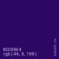 Цвет #2C0864 в цветовой модели RGB обозначается тремя октетами (44, 8, 100) в десятичном формате и #2C0864 в шестнадцатиричном (hex) формате, которые являются интенсивностью красного 44 (hex 2C), интенсивность зелёного 8 (hex 08) и интенсивность синего 100 (hex 64).