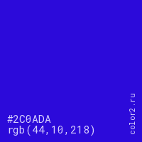 Цвет #2C0ADA в цветовой модели RGB обозначается тремя октетами (44, 10, 218) в десятичном формате и #2C0ADA в шестнадцатиричном (hex) формате, которые являются интенсивностью красного 44 (hex 2C), интенсивность зелёного 10 (hex 0A) и интенсивность синего 218 (hex DA).