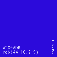 Цвет #2C0ADB в цветовой модели RGB обозначается тремя октетами (44, 10, 219) в десятичном формате и #2C0ADB в шестнадцатиричном (hex) формате, которые являются интенсивностью красного 44 (hex 2C), интенсивность зелёного 10 (hex 0A) и интенсивность синего 219 (hex DB).