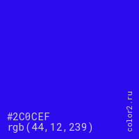 Цвет #2C0CEF в цветовой модели RGB обозначается тремя октетами (44, 12, 239) в десятичном формате и #2C0CEF в шестнадцатиричном (hex) формате, которые являются интенсивностью красного 44 (hex 2C), интенсивность зелёного 12 (hex 0C) и интенсивность синего 239 (hex EF).