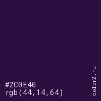Цвет #2C0E40 в цветовой модели RGB обозначается тремя октетами (44, 14, 64) в десятичном формате и #2C0E40 в шестнадцатиричном (hex) формате, которые являются интенсивностью красного 44 (hex 2C), интенсивность зелёного 14 (hex 0E) и интенсивность синего 64 (hex 40).