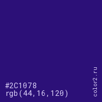 Цвет #2C1078 в цветовой модели RGB обозначается тремя октетами (44, 16, 120) в десятичном формате и #2C1078 в шестнадцатиричном (hex) формате, которые являются интенсивностью красного 44 (hex 2C), интенсивность зелёного 16 (hex 10) и интенсивность синего 120 (hex 78).