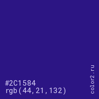 Цвет #2C1584 в цветовой модели RGB обозначается тремя октетами (44, 21, 132) в десятичном формате и #2C1584 в шестнадцатиричном (hex) формате, которые являются интенсивностью красного 44 (hex 2C), интенсивность зелёного 21 (hex 15) и интенсивность синего 132 (hex 84).