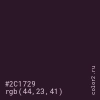 Цвет #2C1729 в цветовой модели RGB обозначается тремя октетами (44, 23, 41) в десятичном формате и #2C1729 в шестнадцатиричном (hex) формате, которые являются интенсивностью красного 44 (hex 2C), интенсивность зелёного 23 (hex 17) и интенсивность синего 41 (hex 29).