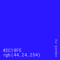 Цвет #2C18FE в цветовой модели RGB обозначается тремя октетами (44, 24, 254) в десятичном формате и #2C18FE в шестнадцатиричном (hex) формате, которые являются интенсивностью красного 44 (hex 2C), интенсивность зелёного 24 (hex 18) и интенсивность синего 254 (hex FE).