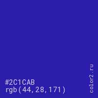 Цвет #2C1CAB в цветовой модели RGB обозначается тремя октетами (44, 28, 171) в десятичном формате и #2C1CAB в шестнадцатиричном (hex) формате, которые являются интенсивностью красного 44 (hex 2C), интенсивность зелёного 28 (hex 1C) и интенсивность синего 171 (hex AB).