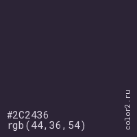Цвет #2C2436 в цветовой модели RGB обозначается тремя октетами (44, 36, 54) в десятичном формате и #2C2436 в шестнадцатиричном (hex) формате, которые являются интенсивностью красного 44 (hex 2C), интенсивность зелёного 36 (hex 24) и интенсивность синего 54 (hex 36).