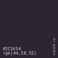 Цвет #2C2634 в цветовой модели RGB обозначается тремя октетами (44, 38, 52) в десятичном формате и #2C2634 в шестнадцатиричном (hex) формате, которые являются интенсивностью красного 44 (hex 2C), интенсивность зелёного 38 (hex 26) и интенсивность синего 52 (hex 34).