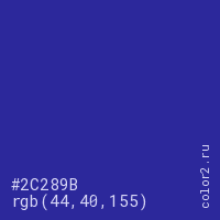 Цвет #2C289B в цветовой модели RGB обозначается тремя октетами (44, 40, 155) в десятичном формате и #2C289B в шестнадцатиричном (hex) формате, которые являются интенсивностью красного 44 (hex 2C), интенсивность зелёного 40 (hex 28) и интенсивность синего 155 (hex 9B).