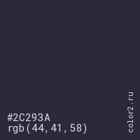 Цвет #2C293A в цветовой модели RGB обозначается тремя октетами (44, 41, 58) в десятичном формате и #2C293A в шестнадцатиричном (hex) формате, которые являются интенсивностью красного 44 (hex 2C), интенсивность зелёного 41 (hex 29) и интенсивность синего 58 (hex 3A).