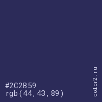 Цвет #2C2B59 в цветовой модели RGB обозначается тремя октетами (44, 43, 89) в десятичном формате и #2C2B59 в шестнадцатиричном (hex) формате, которые являются интенсивностью красного 44 (hex 2C), интенсивность зелёного 43 (hex 2B) и интенсивность синего 89 (hex 59).