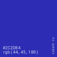 Цвет #2C2DB4 в цветовой модели RGB обозначается тремя октетами (44, 45, 180) в десятичном формате и #2C2DB4 в шестнадцатиричном (hex) формате, которые являются интенсивностью красного 44 (hex 2C), интенсивность зелёного 45 (hex 2D) и интенсивность синего 180 (hex B4).