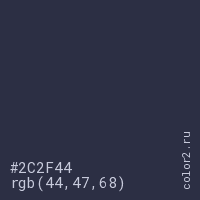 Цвет #2C2F44 в цветовой модели RGB обозначается тремя октетами (44, 47, 68) в десятичном формате и #2C2F44 в шестнадцатиричном (hex) формате, которые являются интенсивностью красного 44 (hex 2C), интенсивность зелёного 47 (hex 2F) и интенсивность синего 68 (hex 44).