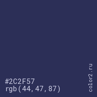 Цвет #2C2F57 в цветовой модели RGB обозначается тремя октетами (44, 47, 87) в десятичном формате и #2C2F57 в шестнадцатиричном (hex) формате, которые являются интенсивностью красного 44 (hex 2C), интенсивность зелёного 47 (hex 2F) и интенсивность синего 87 (hex 57).