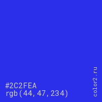 Цвет #2C2FEA в цветовой модели RGB обозначается тремя октетами (44, 47, 234) в десятичном формате и #2C2FEA в шестнадцатиричном (hex) формате, которые являются интенсивностью красного 44 (hex 2C), интенсивность зелёного 47 (hex 2F) и интенсивность синего 234 (hex EA).