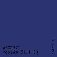 Цвет #2C3371 в цветовой модели RGB обозначается тремя октетами (44, 51, 113) в десятичном формате и #2C3371 в шестнадцатиричном (hex) формате, которые являются интенсивностью красного 44 (hex 2C), интенсивность зелёного 51 (hex 33) и интенсивность синего 113 (hex 71).